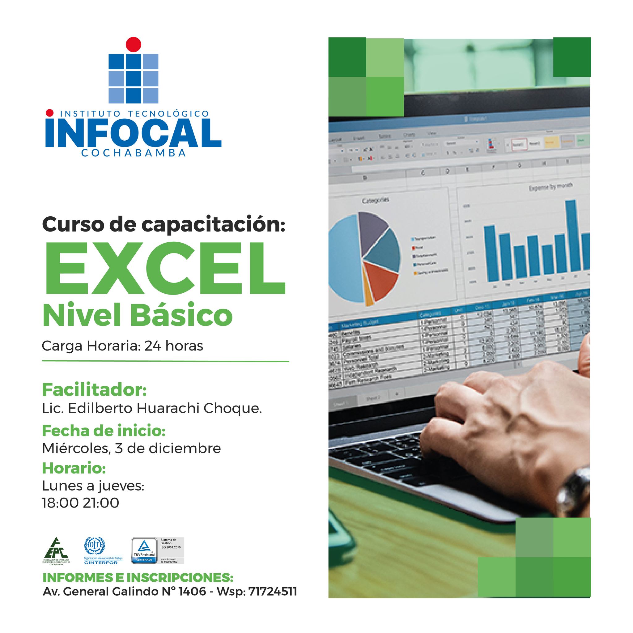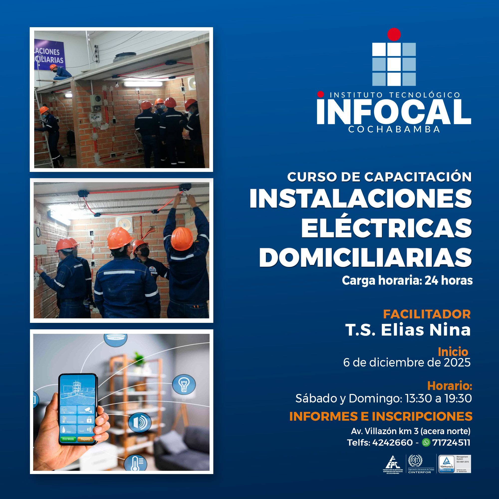 DESCUBRE TU FUTURO PROFESIONAL CON INFOCAL COCHABAMBA Formación práctica y empleabilidad real Carreras Técnicas Profesionales - I / 2026 CARRERA AUTOTRÓNICA 6 SemestresDisponible en Subsede Tupuraya CATÁLOGO CARRERA ELECTROMECÁNICA INDUSTRIAL 6 SemestresDisponible en Subsede Arocagua CATÁLOGO CARRERA ELECTROTECNIA INDUSTRIAL 6 SemestresDisponible en Subsede Arocagua CATÁLOGO CARRERA GASTRONOMÍA 3 AñosDisponible en Subsede Tupuraya CATÁLOGO CARRERA MECÁNICA AUTOMOTRIZ 6 SemestresDisponible en Subsede Tupuraya CATÁLOGO CARRERA MECÁNICA INDUSTRIAL 6 SemestresDisponible en Subsede Arocagua CATÁLOGO CARRERA MECATRÓNICA INDUSTRIAL 6 SemestresDisponible en Subsede Arocagua CATÁLOGO CARRERA PARVULARIO 6 SemestresDisponible en Subsede Tupuraya CATÁLOGO CARRERA TECNOLOGÍA E INFORMÁTICA 6 SemestresDisponible en Subsede Tupuraya CATÁLOGO Cursos de Capacitación CURSO EXCEL NIVEL BÁSICO 3 de DiciembreLunes a Jueves DETALLES CURSO PANADERIA NAVIDEÑA 6 de DiciembreSábados DETALLES CURSO INSTALACIONES ELÉCTRICAS DOMICILIARIAS 6 de DiciembreSabado y Domingo DETALLES CURSO SOLDADURA SMAW 8 de DiciembreLunes, Miercoles y Viernes DETALLES CURSO COCINA NAVIDEÑA 13 de DiciembreSábado DETALLES